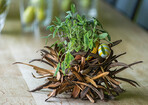 ANNETTE KAMPING war 1994 Deutsche Meisterin der Floristen und 1995 Vize-Europameisterin. Nach einigen Jahren als Inhaberin eines Geschäfts in Stuttgart zog sie 1999 nach Herborn in Hessen, wo sie 2001 ihre Schule Blumenwerk eröffnete. Annette Kamping ist "Stammautorin" von "florieren!". Zudem sind von ihr das Buch "Colours" und eine Monografie in der Reihe "Meisterfloristen" beim Verlag Eugen Ulmer erschienen. 1 Aus einer Baumscheibe und Brennholzstücken lassen sich natürliche Pflanzgefäße bauen. Die kleinen Keile werden verschachtelt auf die Scheibe geschraubt und leicht mit Farbe lasiert. Die Kräuter werden in Tontöpfen hinzugefügt.