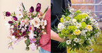 "Das ist der Frühling, tolle Blumen und Kirschblütenzweige", erklärt Markus Bopfinger (blumenfenster_dachau) zu seinem Strauß. Die typischen weiß-gelben Sträuße mag er nicht, viel lieber sind ihm rosa lila Farbtöne. "Diese Farbkombi verkaufen wir hier viel, ich sage immer, wir sind der Rosa-Lila-Laden", fügt er lachend hinzu. Zur Anmerkung, dass sein Strauß mehr als 30 € Wert ist, erklärt er: "Bei den Preisen hier im Münchner Raum hätten wir vermutlich nur fünf Blumen in der Hand gehabt." Zudem wirken Sträuße auf Bildern immer kleiner, sodass man sie, damit sie die entsprechende Wirkung entfalten, größer binden muss.