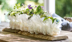 Pergamentpapier: Mit transparentem, glänzendem Pergamentpapier lassen sich interessante und kostengünstige Ideen verwirklichen – Mitnahmefloristik genauso wie große Objekte. Große Elemente werden am besten mit Holzleim eingestrichen und sind dann schmutz- und wasserabweisend, bei kleineren Werkstücken ist das nicht nötig. Durch das Verarbeiten des Papiers in Variationen verleiht man dem Laden nicht nur einen neuen Look, sondern setzt Handwerk und Kreativität in Szene. Für eine Tischdekoration werden gecrashte, 60 cm lange Papierstreifen „doppelt geknotet“ und auf ein Holzbrett getackert.