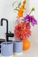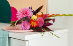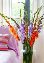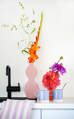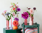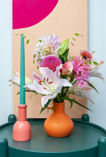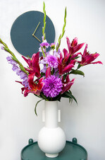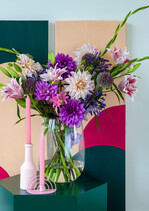 Dabei spielen insbesondere kräftige Sommerblumen eine Rolle. Dazu passen großblumige Lilien und Dahlien, in Kombination mit Gladiolen und Nerine. Verwenden Sie sie in kontrastierenden Farben. Die Palette besteht aus weichen Pastelltönen, denen kräftige Farben wie Gelb, Terra, Blau und Lila hinzugefügt wurden. Stellen Sie die Blumen in Vasen oder Schalen spielerisch auf einen Sockel, als ob sie auf einer Bühne stünden. Machen Sie es spannend mit Bogen-, Treppen- und geometrischen Formen.